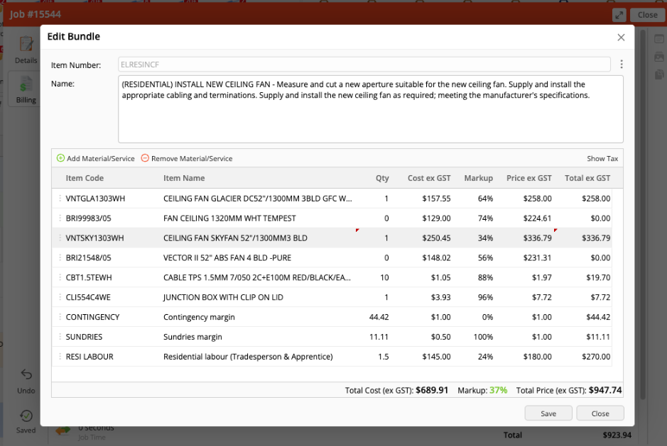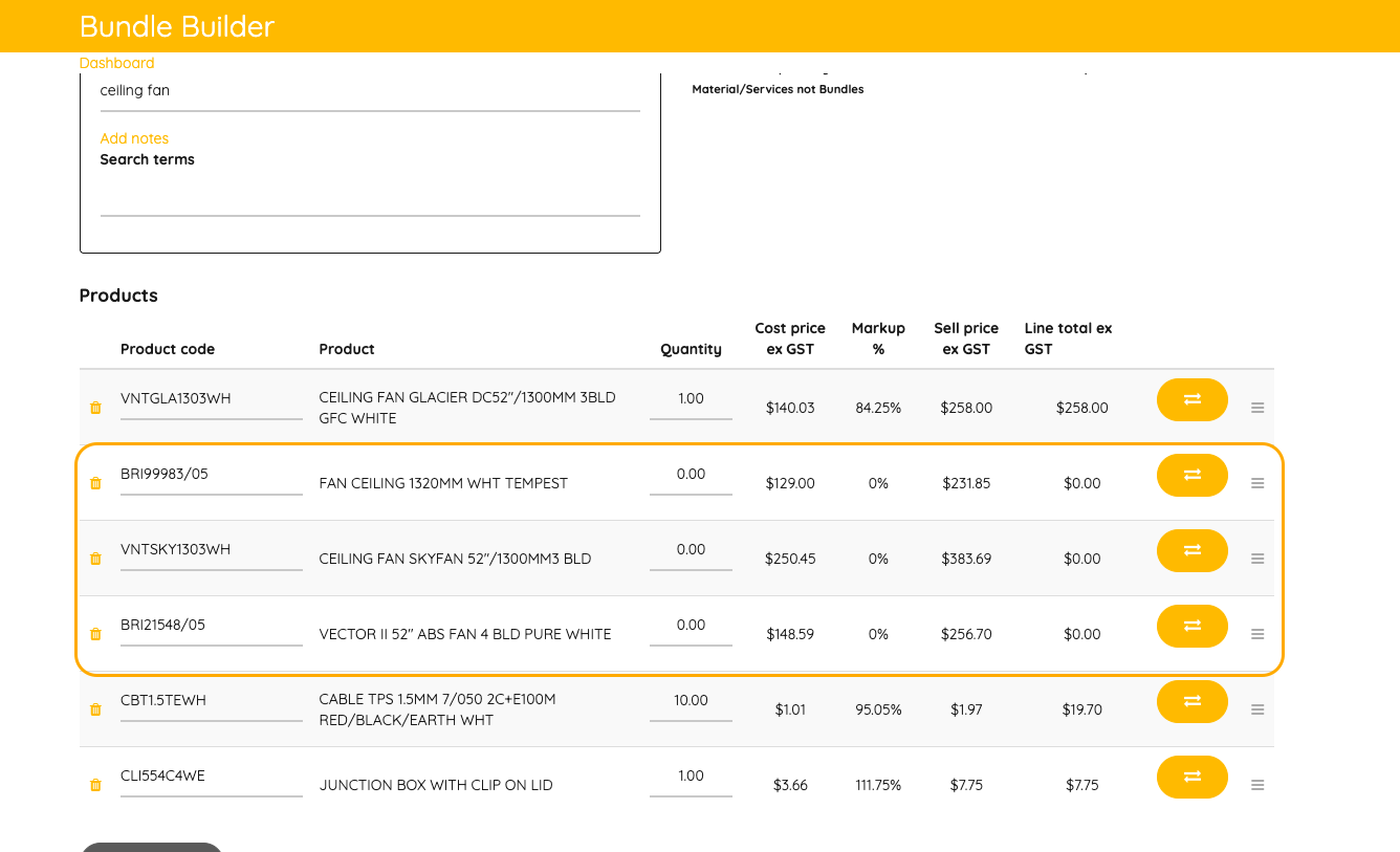 Sometimes you may want to offer your customers a choice of products within a single job — for example, a “Good, Better, Best” fan option. Burdi allows you to set this up as a bundle, so you can quickly swap between product options at the job level without needing to rebuild your quote.
